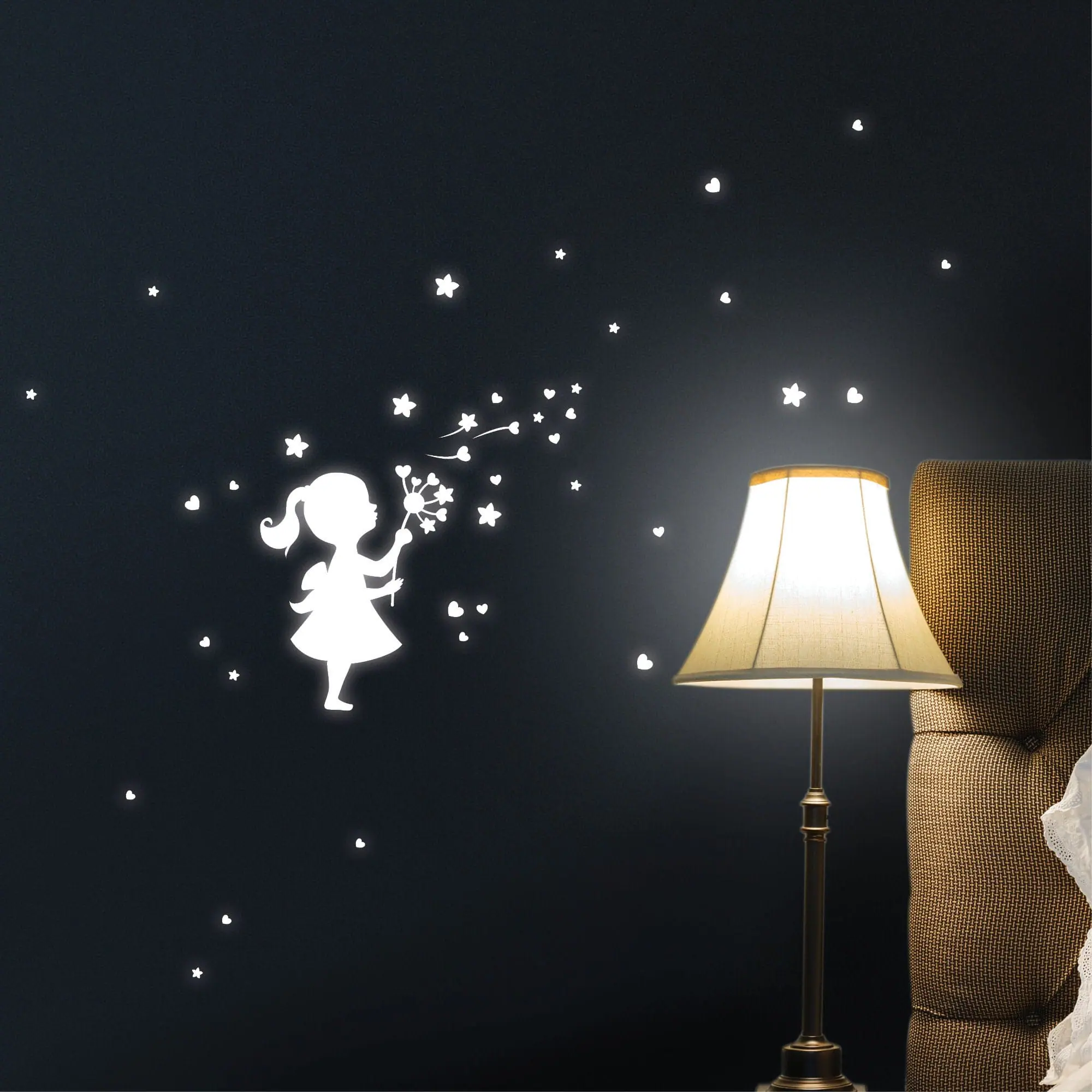 In diesem Set aus fluoreszierenden Wandklebern befinden sich ein Mädchen mit Pusteblume und 74 leuchtende Sterne, 47 leuchtende Herzen – fluoreszierend. Zaubere Deinen Kindern eine kleine leuchtende Welt in ihr Kinderzimmer, wenn es dunkel wird. Mit diesem Set hast Du eine schöne Auswahl an leuchtenden