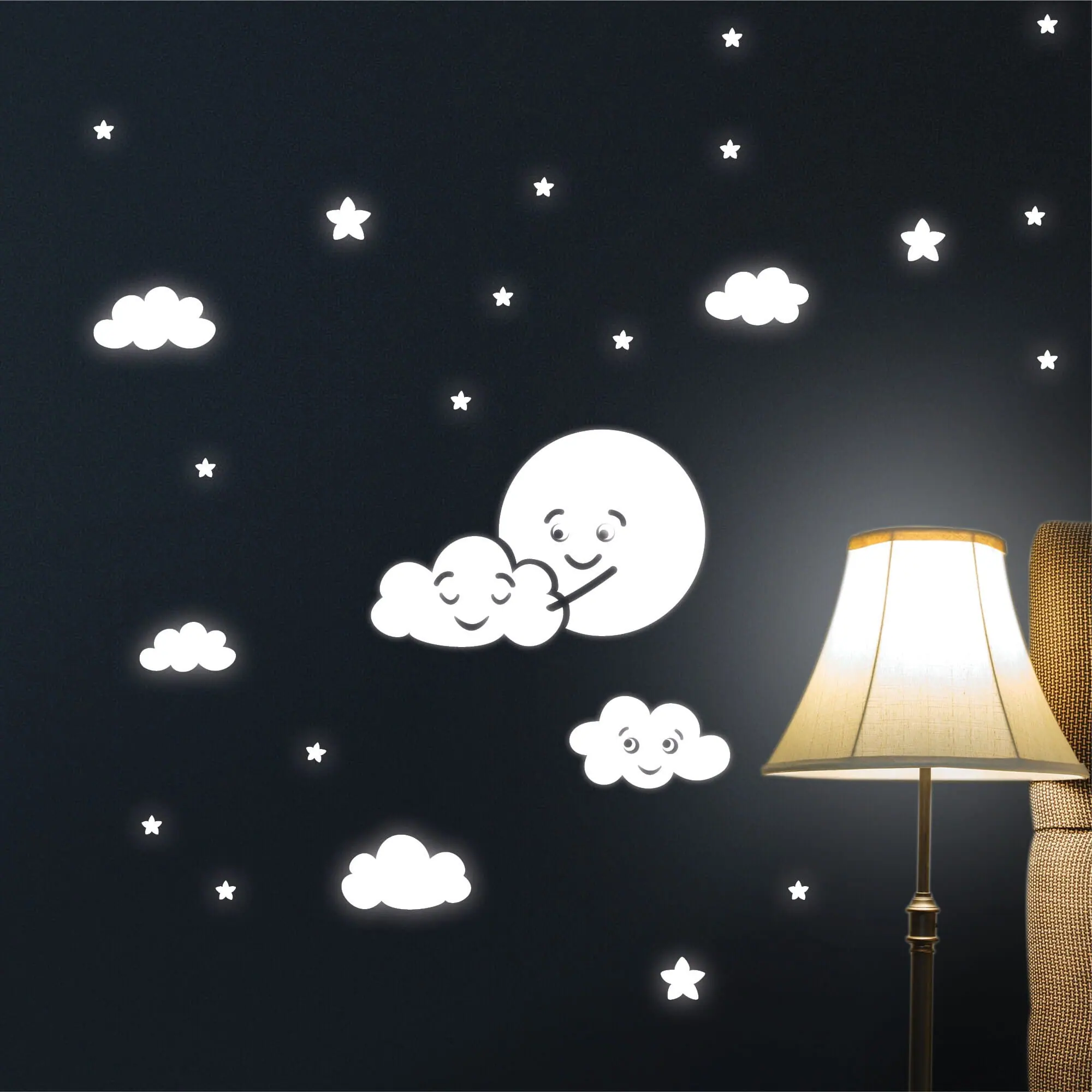 Leuchtaufkleber Kinderzimmer Mond und Wolken mit Gesicht Sternen Leuchtsterne leuchten im Dunklen